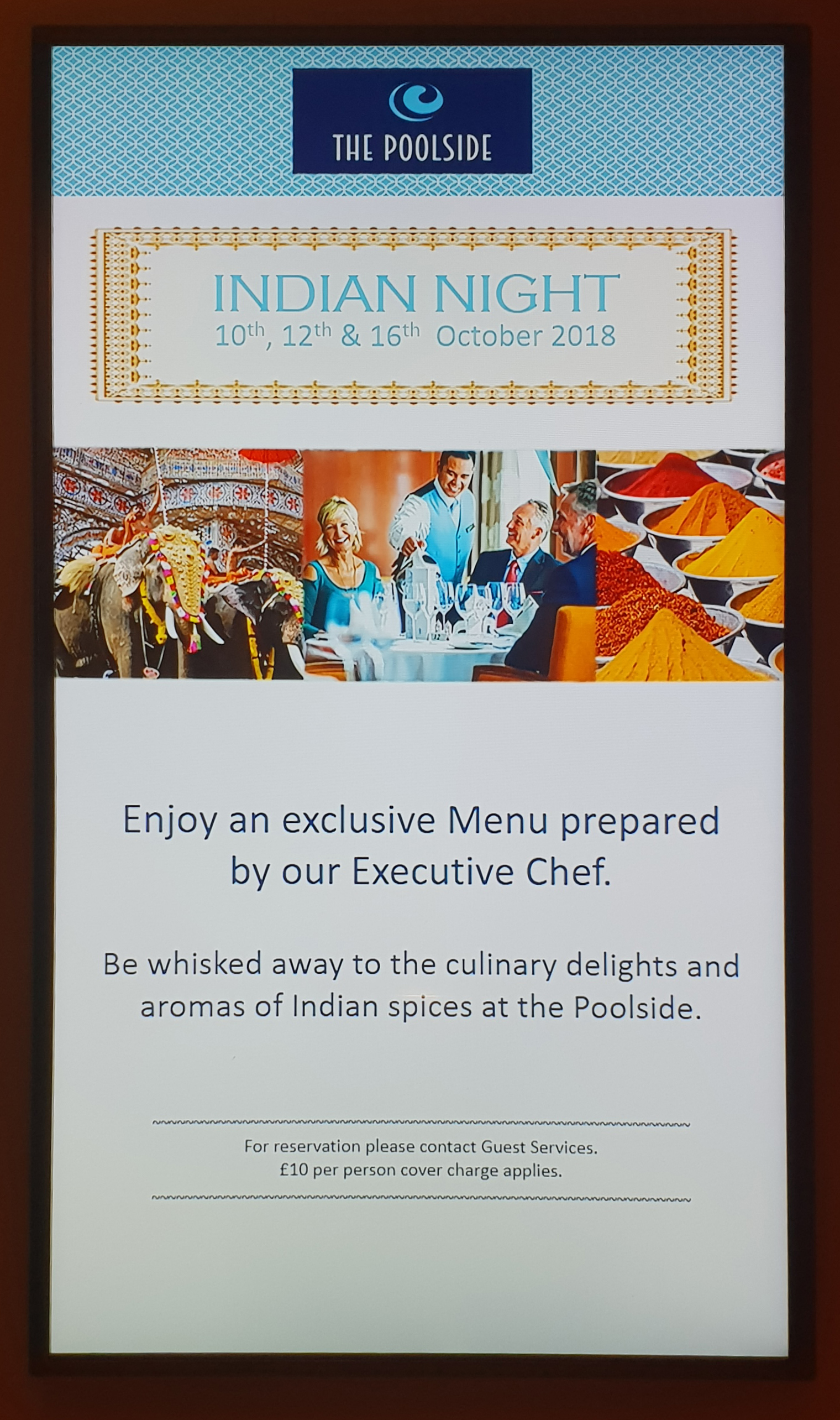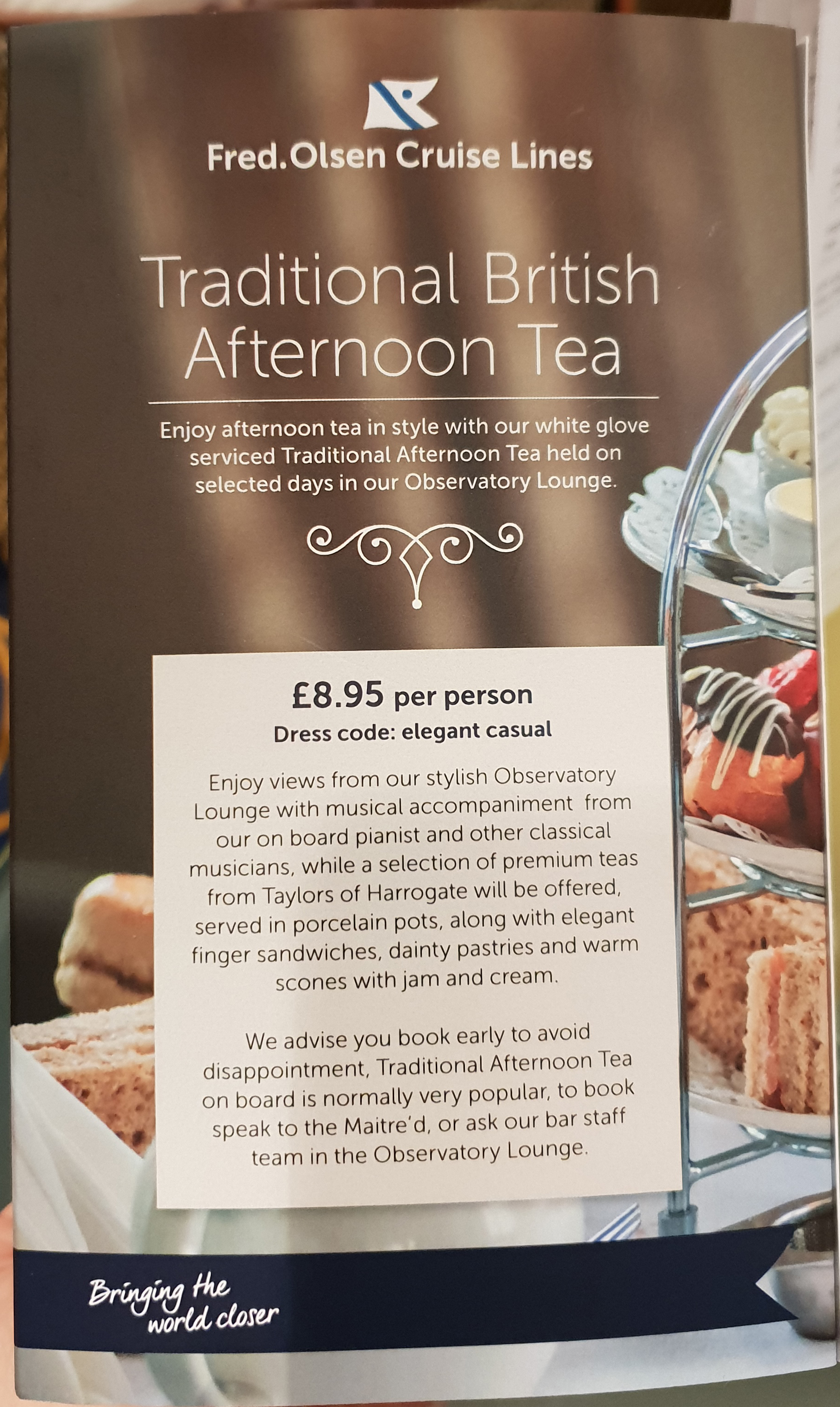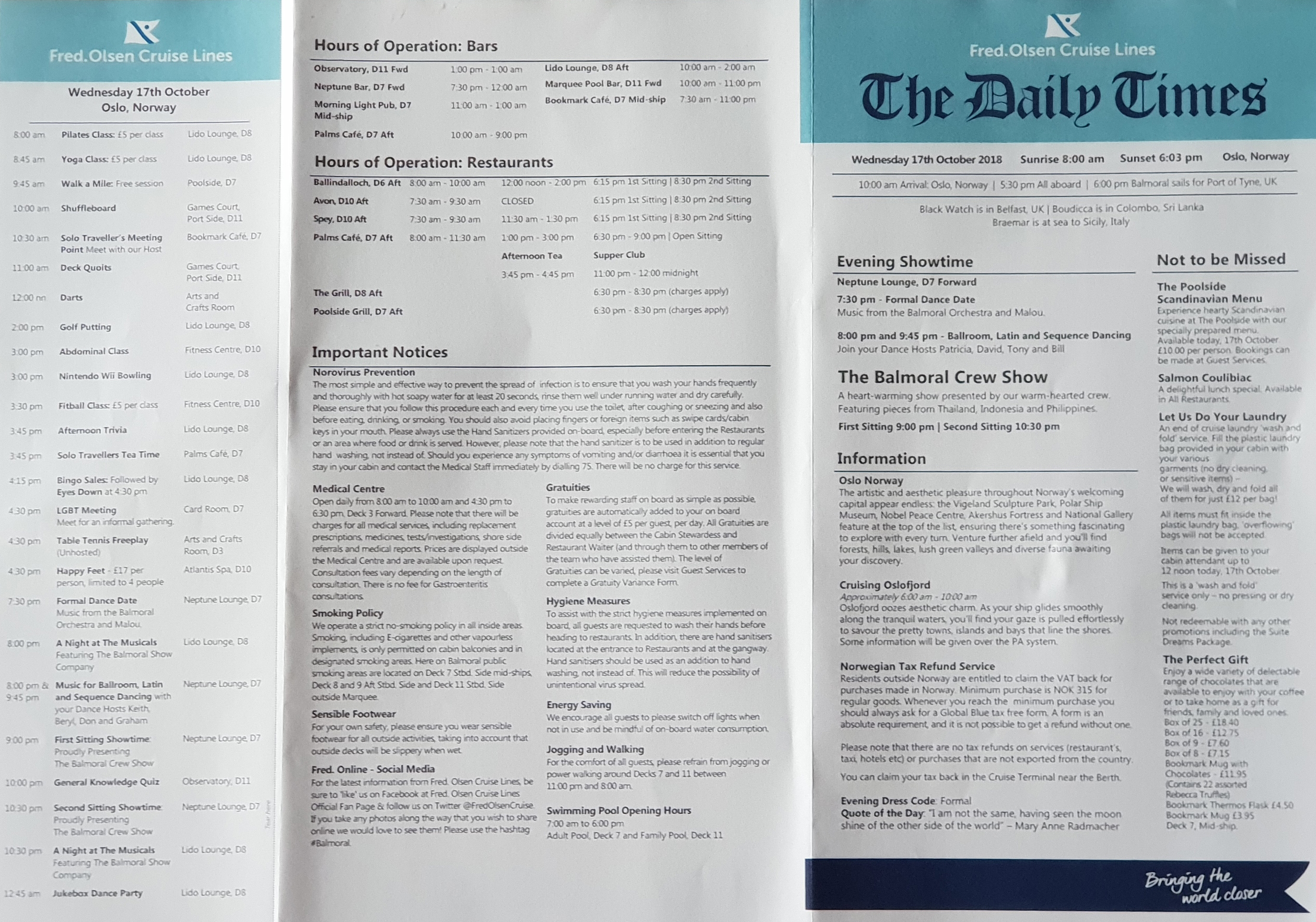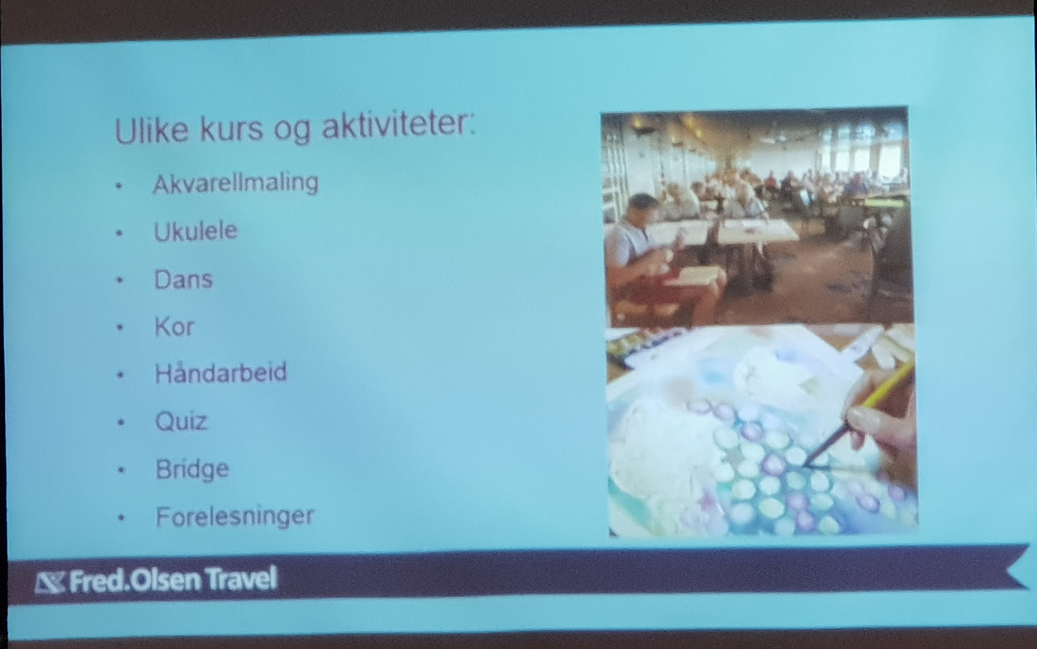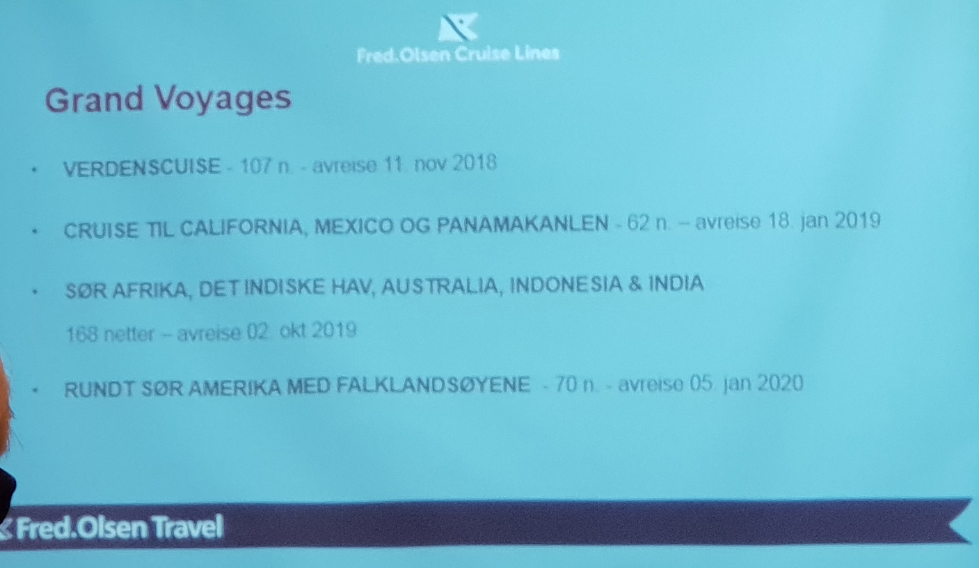 Skipet som helhet er flott, og i likhet med Azamara legger Fred. Olsen vekt på unike opplevelsescruise. Vi ble presentert flere interessante lange cruise med flere av Fred. Olsens skip, som et 62-netters California, Mexico og Panamakanalen-cruise.