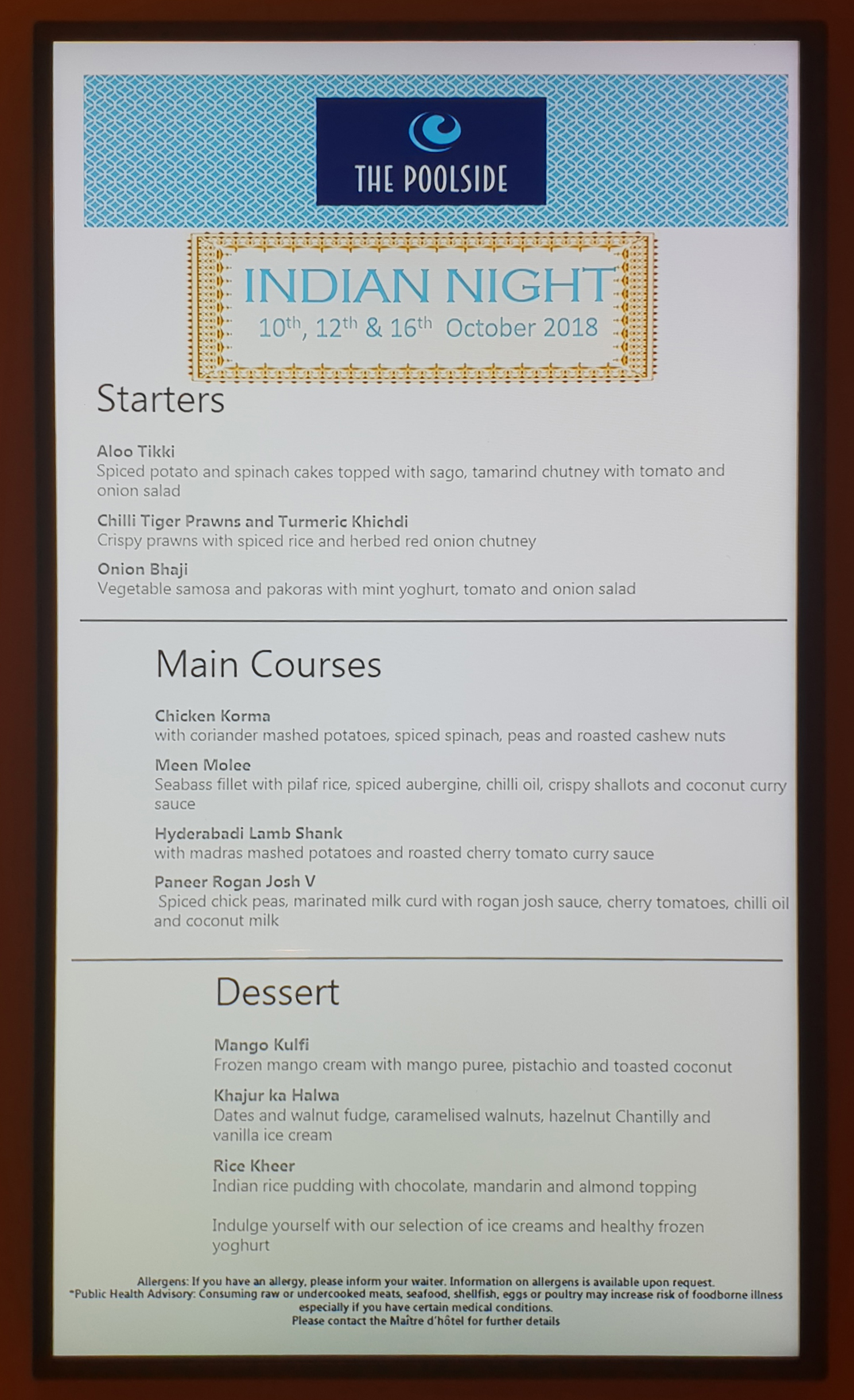 Her finner du ikke barneklubb, klatrevegg eller bowlingbane, men du finner en avslappet stemning med treningsstudio, spa, flere restauranter og rimelige barpriser. Hvis solen titter frem er øvre bassengdekk å anbefale, det fallt i god smak. Hvis været derimot skuffer så vil den høye kvaliteten og utvalget av mat løfte humøret. Vi fikk smake et utvalg av maten ombord og den var fantastisk.