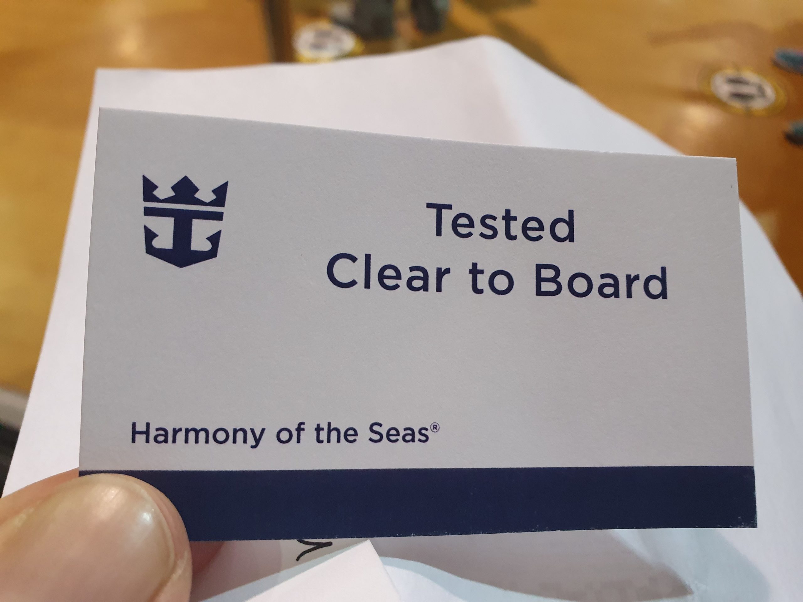 Inne på cruiseterminalen var det innlevering av bagasje og en covid hurtigtest, etterfulgt av 20 minutter venting før man fikk det etterlengtede beviset med «Clear to Board». Spenningen steg da vi kunne gå videre til innsjekking slik vi kjenner det, med sjekk av papirene (inkludert set sail pass) – og vi kunne gå ombord!