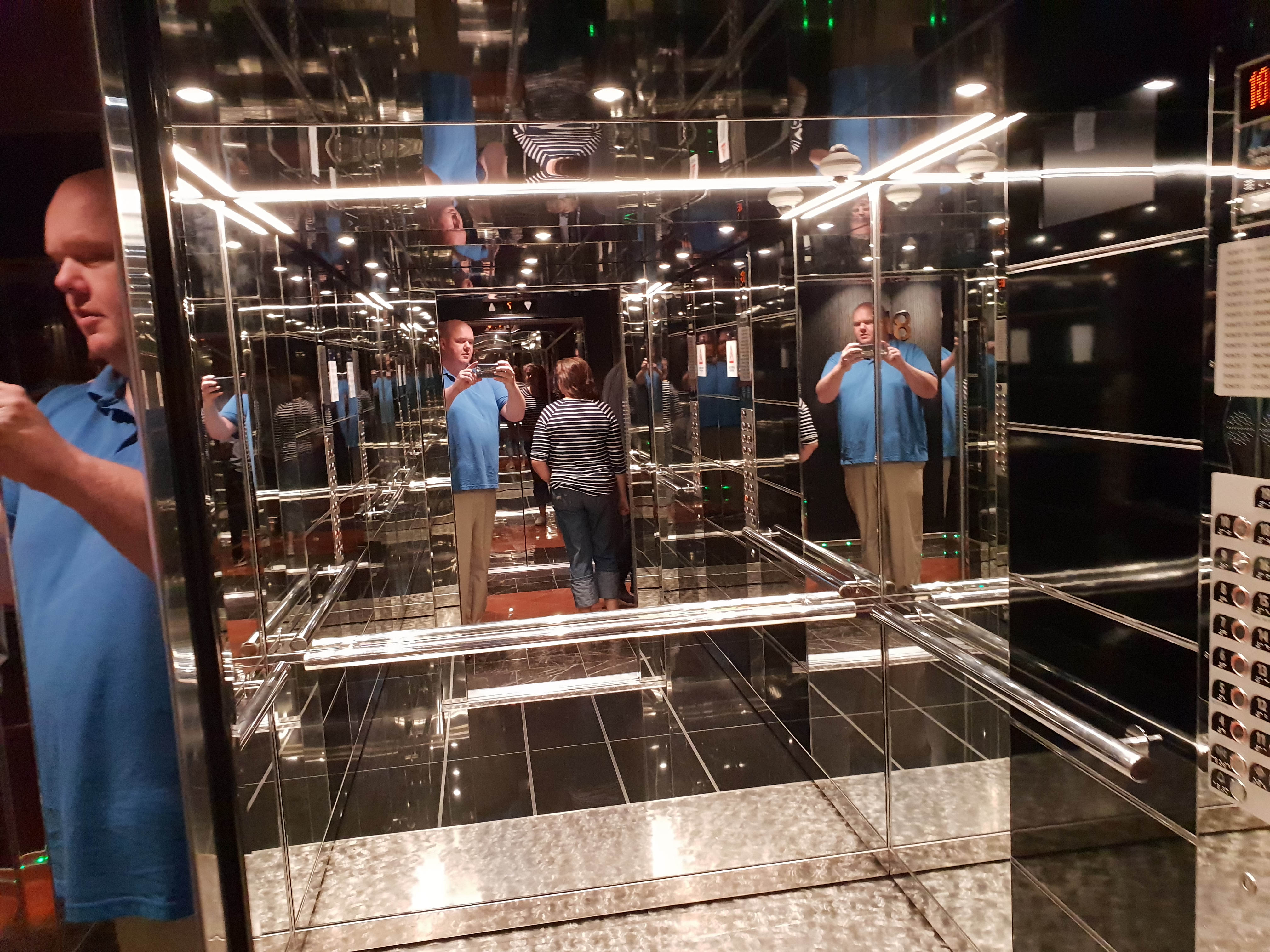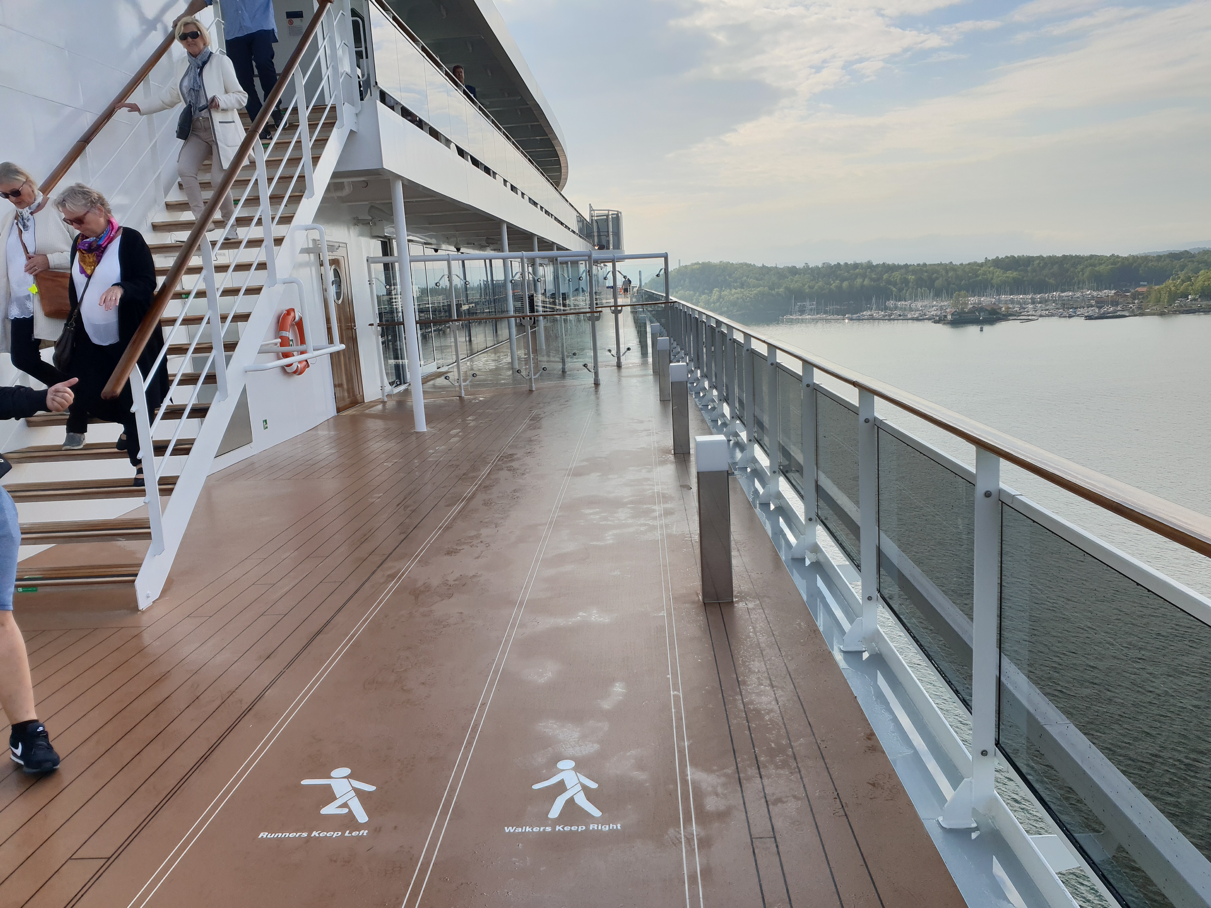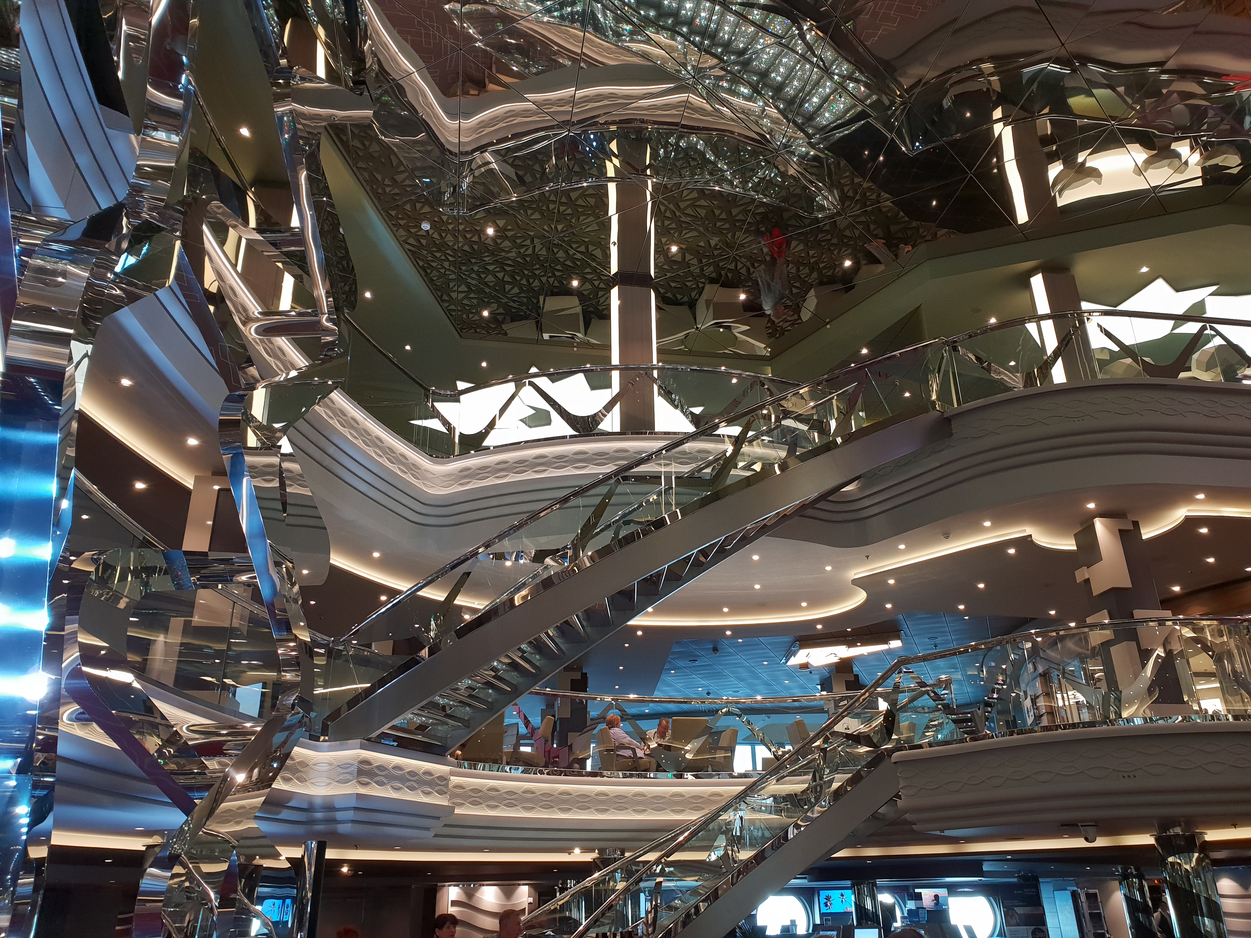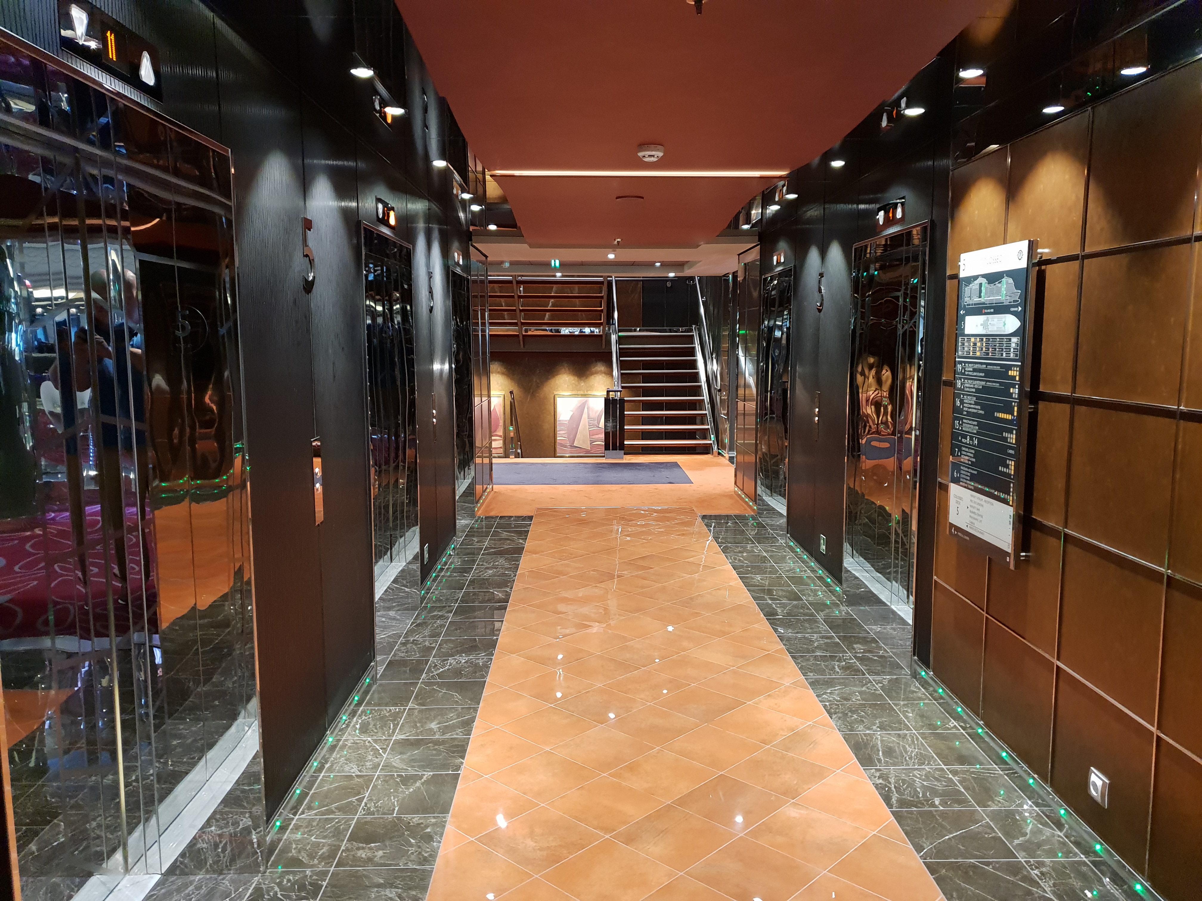 Det glitrer fra Swarovski-krystallene i trappene i Infinity AtriumAlt er fortsatt skinnende nytt i Infinity AtriumHeisområdet føles på en måte romslig, men kanskje en anelse mørkDet så ut til at de fleste heisene ikke har noen utsikt, men bruk av mye reflekterende flater gjør at det ikke blir for mørktOversikt over dekkeneMye åpent dekk langs siden av skipet med plass for gåing og jogging